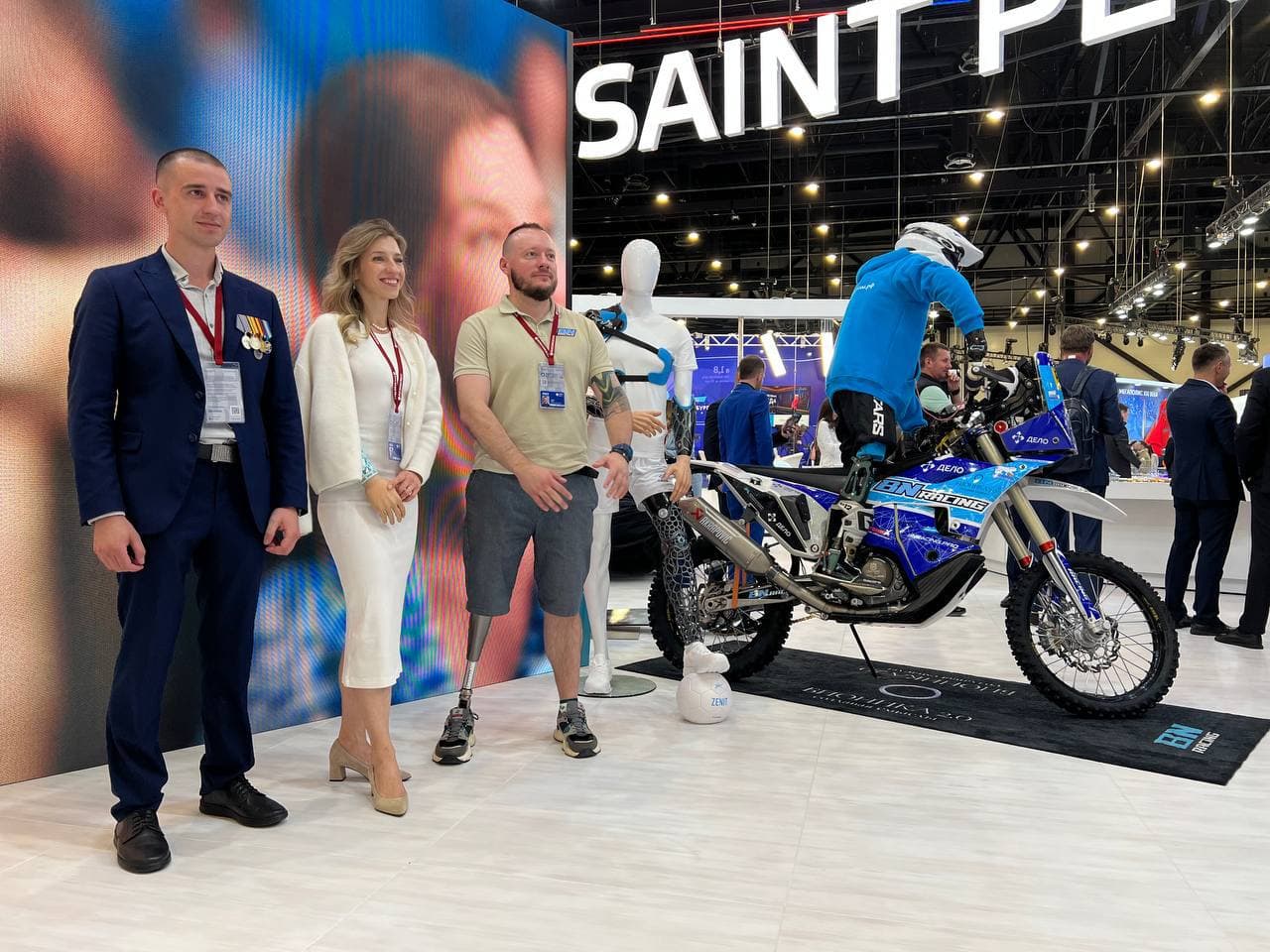 На стенде — реальный боевой байк с манекеном, на котором установлены два уникальных спортивных протеза, созданных специально для участия в раллийных гонках.