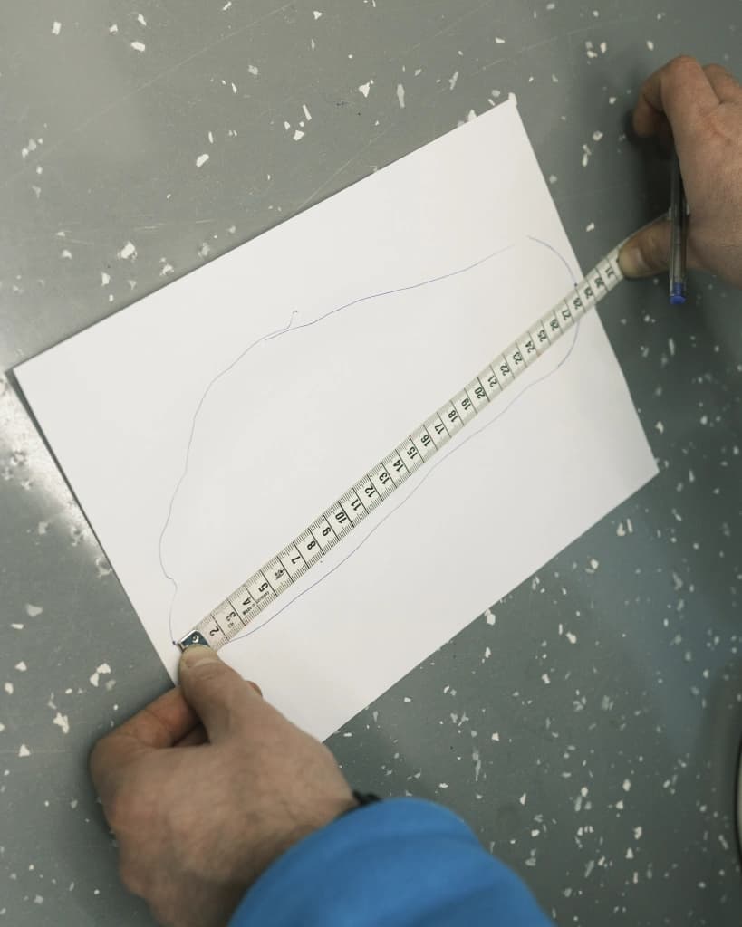 Это нужно для корректного подбора модуля стопы. Встаньте на лист бумаги и обведите стопу ручкой или карандашом. На получившемся контуре определите, какой палец длиннее остальных. От этой точки до центра пятки измерьте расстояние. Это и есть длина вашей стопы.